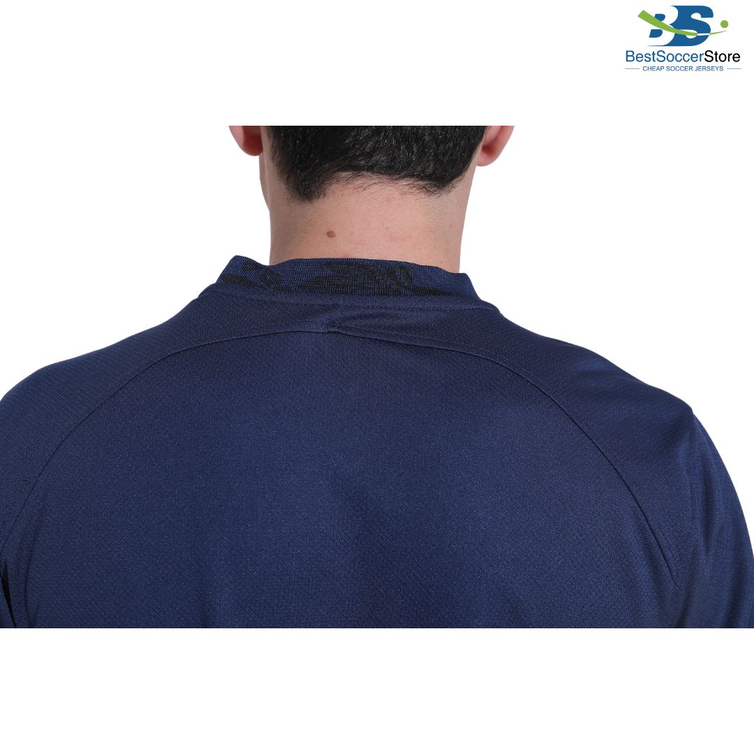The sleeves of the jersey feature the colors blue, with the French national flag colors appearing along the sides. The cuffs of the sleeves are ribbed, which helps to keep the sleeves in place and provides a comfortable fit. The collar of the jersey is a classic round neck design, which adds to the classic look of the jersey. The collar is also ribbed, which helps to keep the neck in place and provides a comfortable fit.
